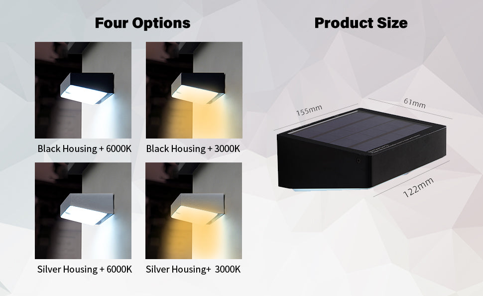 | Lighting mode | Mode 1--25% brightness and 100% when sensor is activated Mode 2--100% brightness only when sensor is activated,then off Mode 3 --50% brightness all night. |
