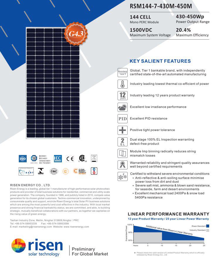 The Risen Energy RSM144-7-430M-450M 144 Cell Mono PERC Module delivers exceptional performance with 20.4% efficiency, 1500VDC system voltage, industry-leading thermal co-efficient, 12-year product warranty, and comprehensive environmental certifications, perfect for utility-scale and large commercial solar installations in challenging environments worldwide.