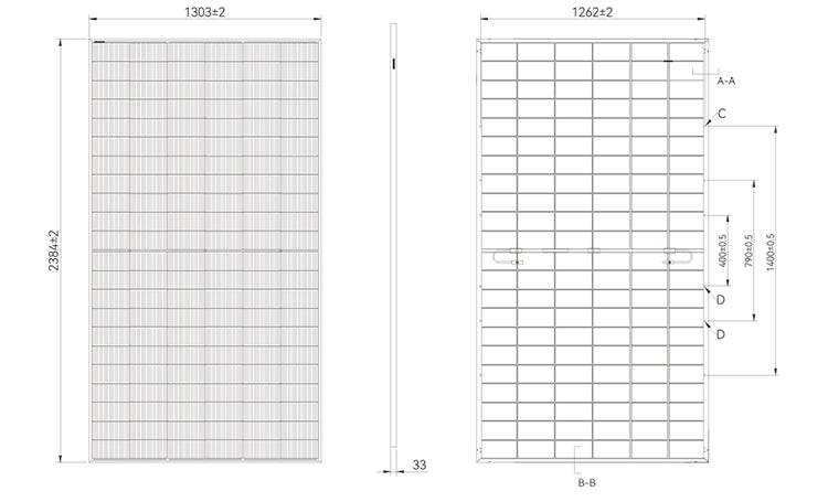 - Module Dimensions: 2384mm x 1303mm x 33mm (±2mm tolerance)